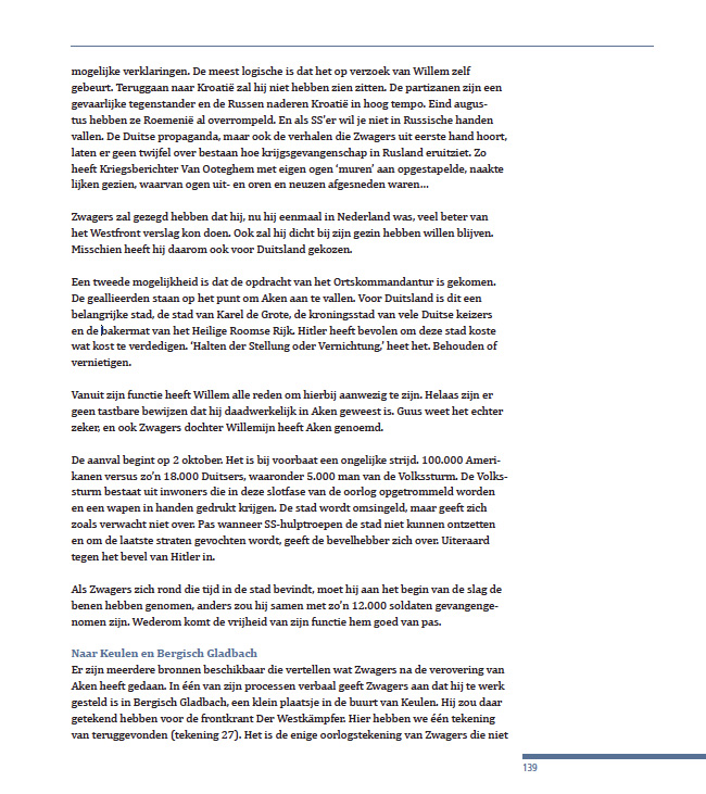 Tijdens de Tweede Wereldoorlog meldden zo’n 25.000 Nederlanders zich als vrijwilliger bij de Waffen-SS om aan het Oostfront tegen het communisme te vechten. Bij dit Legioen voegde zich een groep Nederlandse Kriegsberichter (oorlogsverslaggevers), die de ‘heldendaden’ in beeld moesten brengen voor het Nederlandse publiek. Willem Zwagers (1905-1975) was reclametekenaar en schilder. In 1935 werd hij lid van de NSB. In 1942 trad hij toe tot de SS als Kriegsberichter – Gruppe Zeichnen. Aan het Russische en het Nederlandse front maakte hij propagandatekeningen voor Nederlandse kranten en nationaalsocialistische tijdschriften. Als één van de enige twee Nederlandse SS-tekenaars is het verhaal van Zwagers uniek. Het geeft een interessante inkijk in wat een nationaalsocialistische vrijwilliger en zijn gezin hebben meegemaakt.